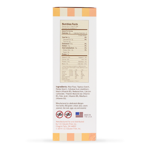 This multi-purpose gluten-free flour mix can be used cup-for-cup for wheat-based flour in most of your family recipes. Enjoy your family favorites and make them gluten-free: cakes, cookies, etc. and can also be used to coat meats before frying, to make a roux, and to thicken sauces. This gluten-free flour mix is enriched with calcium, iron and B Vitamins, so your family will be getting the same fortification that people get with gluten-containing flour!