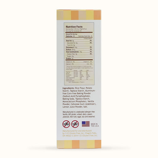 Ingredients: Rice Flour, Potato Starch, Tapioca Flour, Aluminum-free Corn-free Baking Powder (Sodium Acid Pyrophosphate, Baking Soda, Potato Starch, Monocalcium Phosphate), Vanilla Powder, Cellulose Gum, Lemon Juice Powder, Salt. This mix is GMO-free.